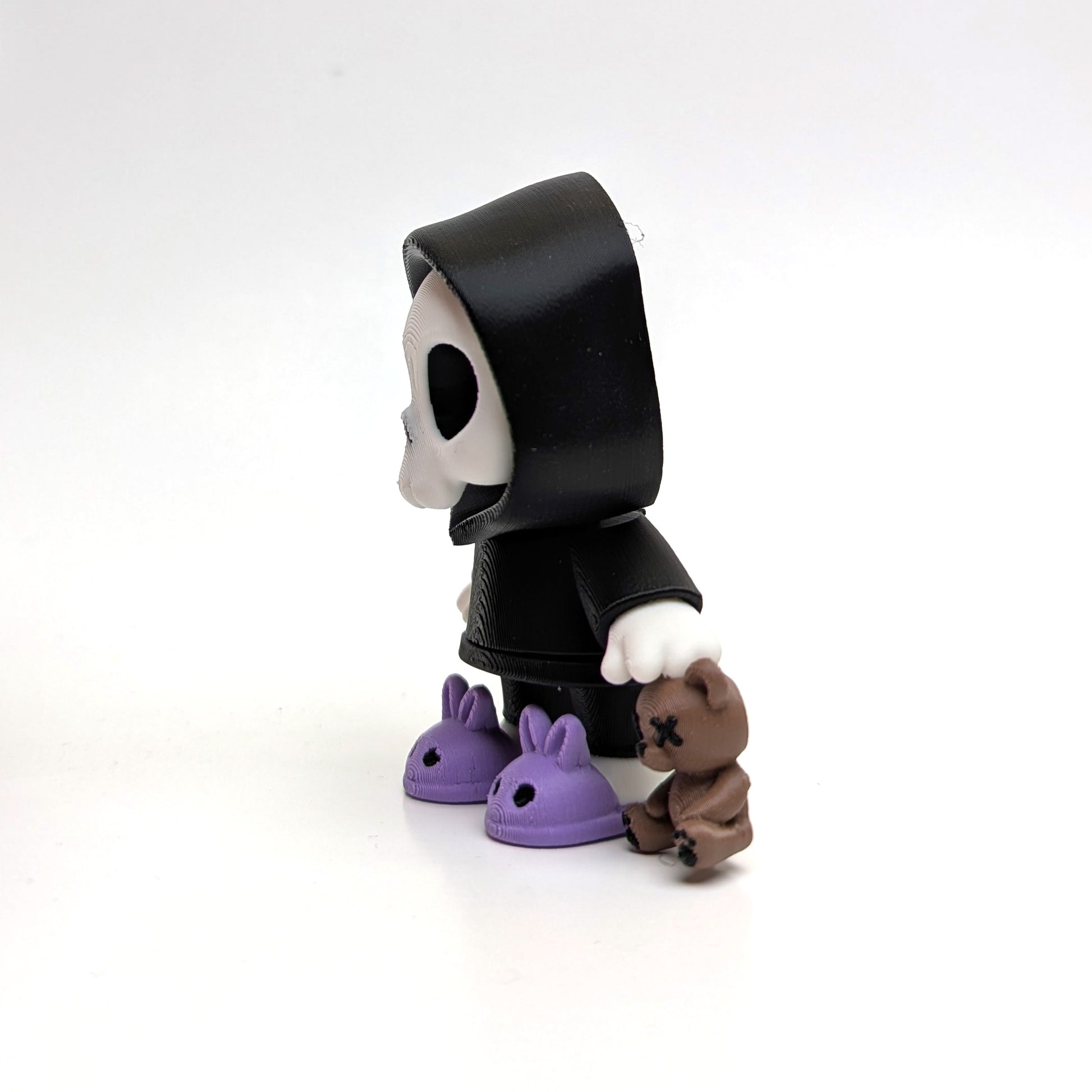 Bring a little spooky charm to your shelf with the Dead Tired Articulated Skeleton Figurine. Featuring a skull-faced character in a black hoodie, cozy purple bunny slippers, and holding a stitched teddy bear, this unique collectible blends creepy and cute in one memorable piece. Each figurine is 3D printed with care, giving it a handcrafted feel that makes it stand out from mass-produced items.